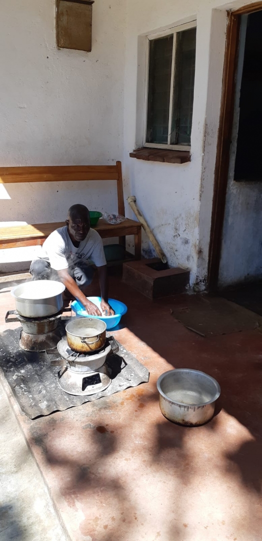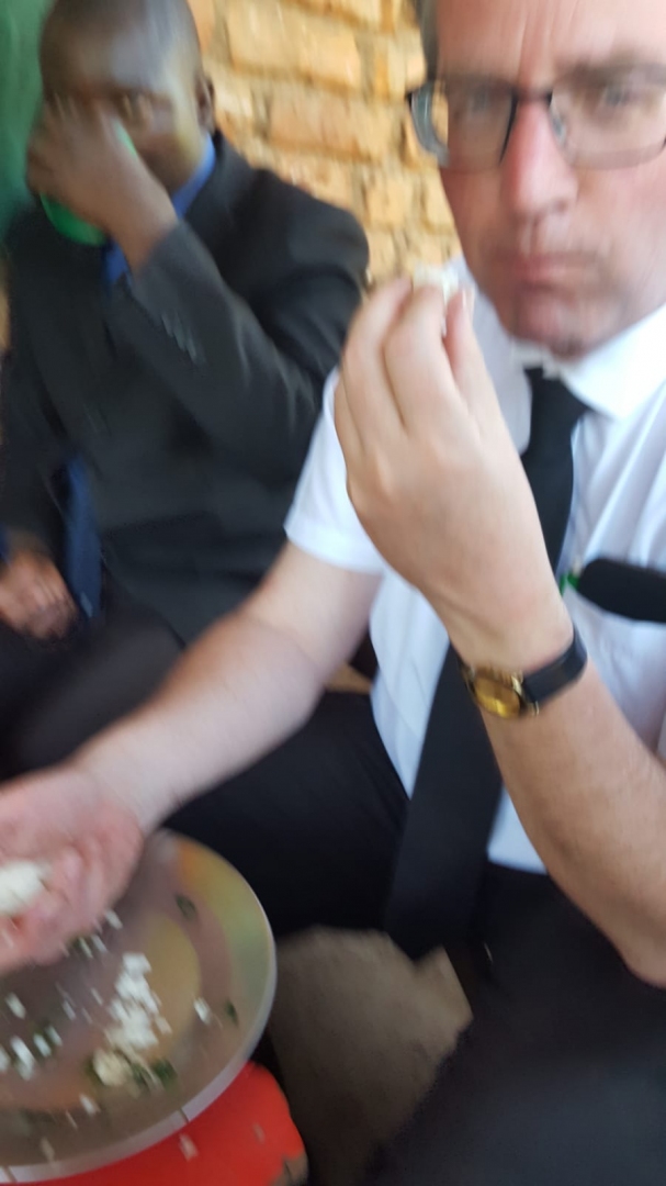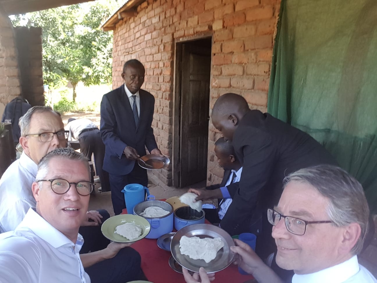 Aan het eind van dit bezoek kregen we als teken van gastvrijheid een maaltijd aangeboden. Deze keer - een maaltijd waar mijn vrouw op hoopte! - maispap of Nsima met wat groente en geitenvlees wat we met onze handen hebben gegeten wat gebruikelijk is in Malawi.