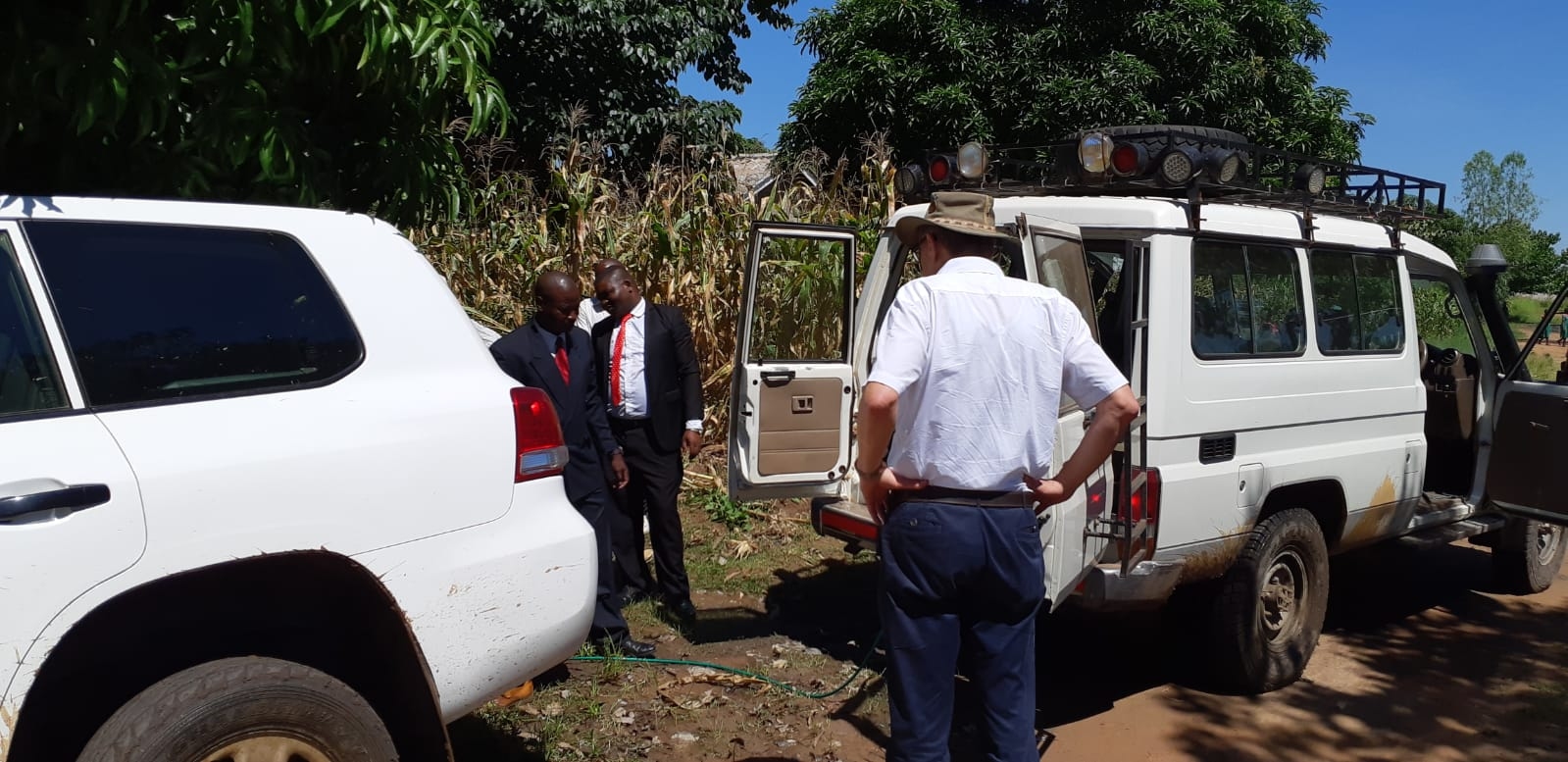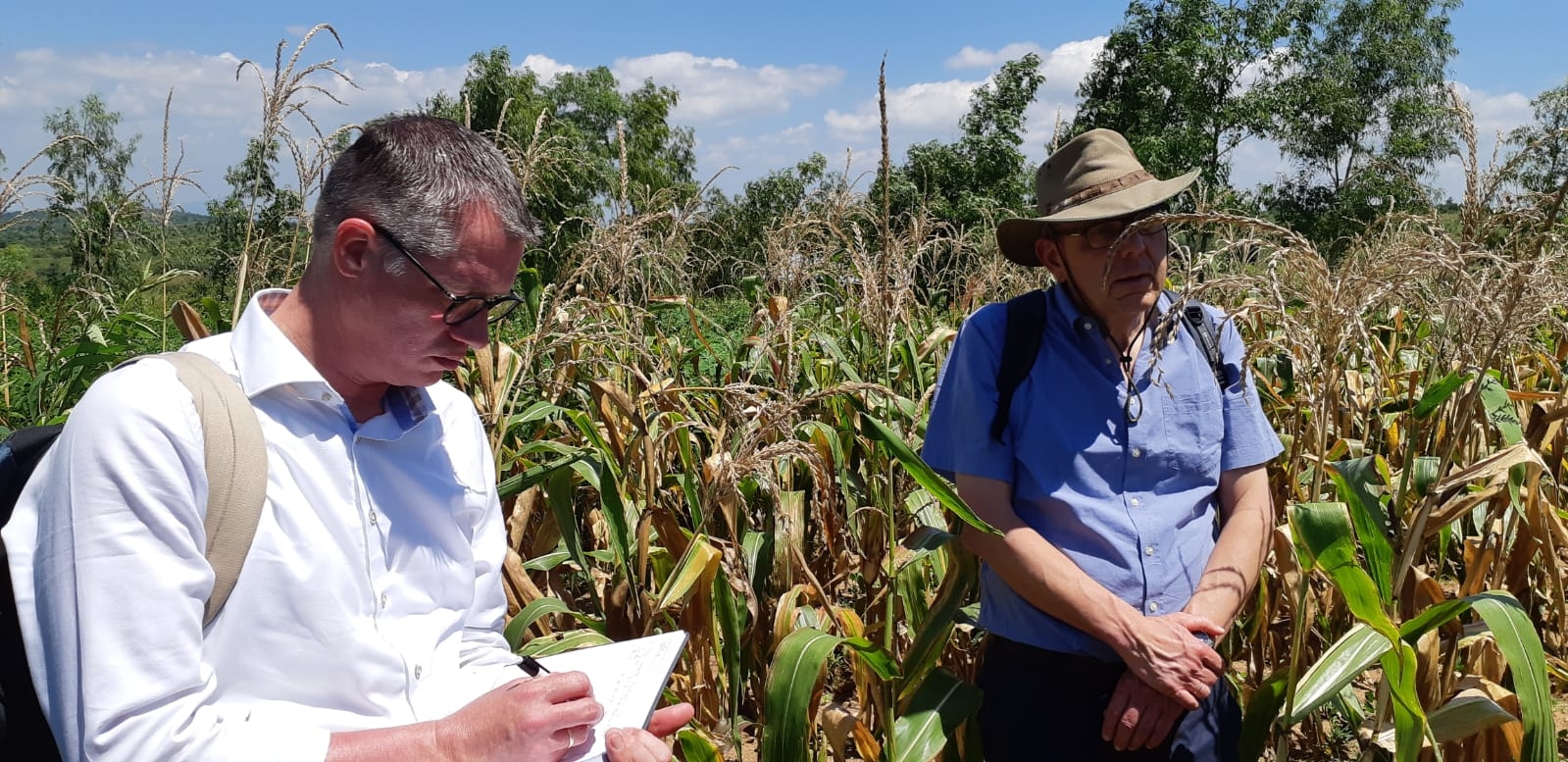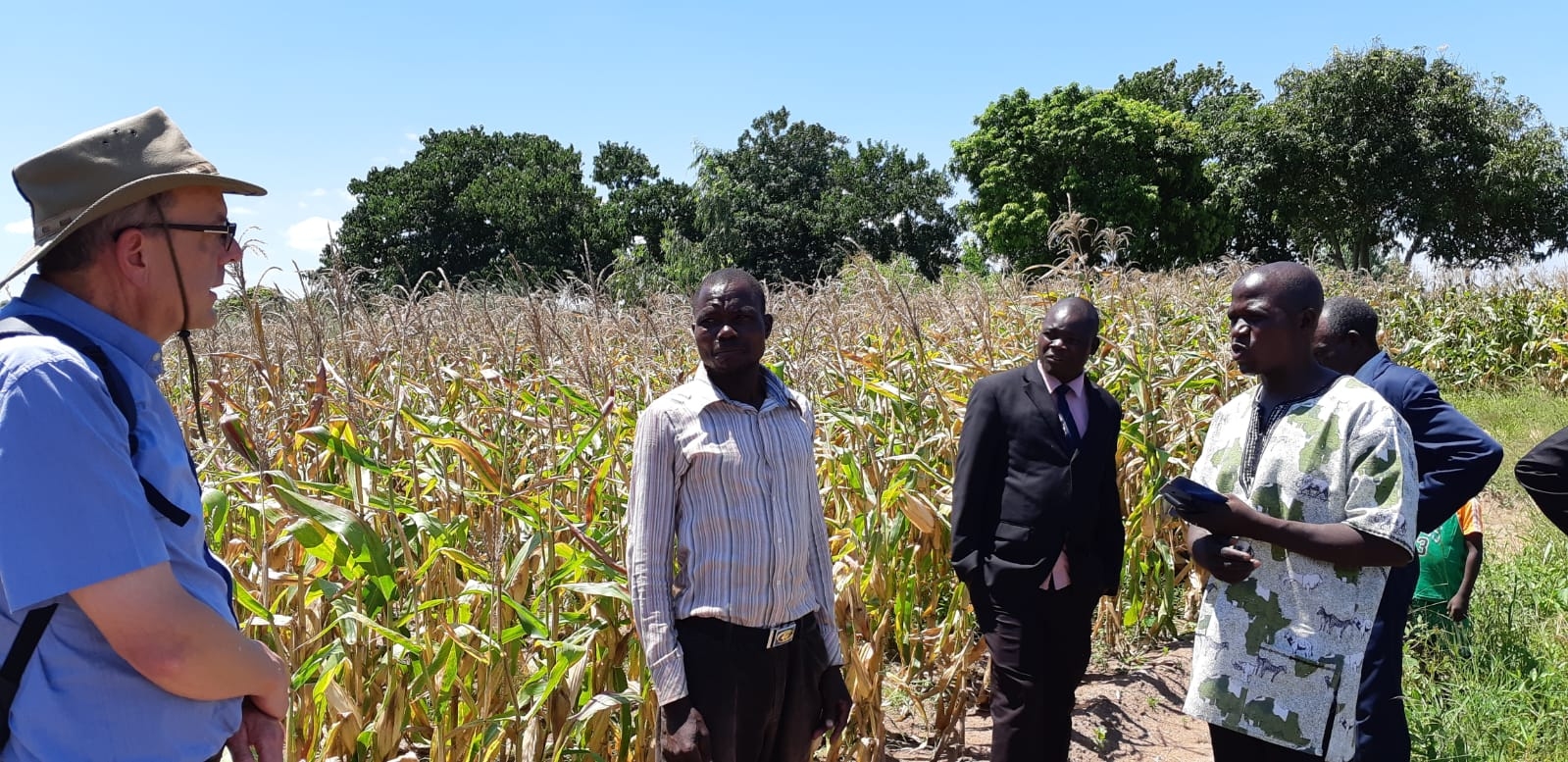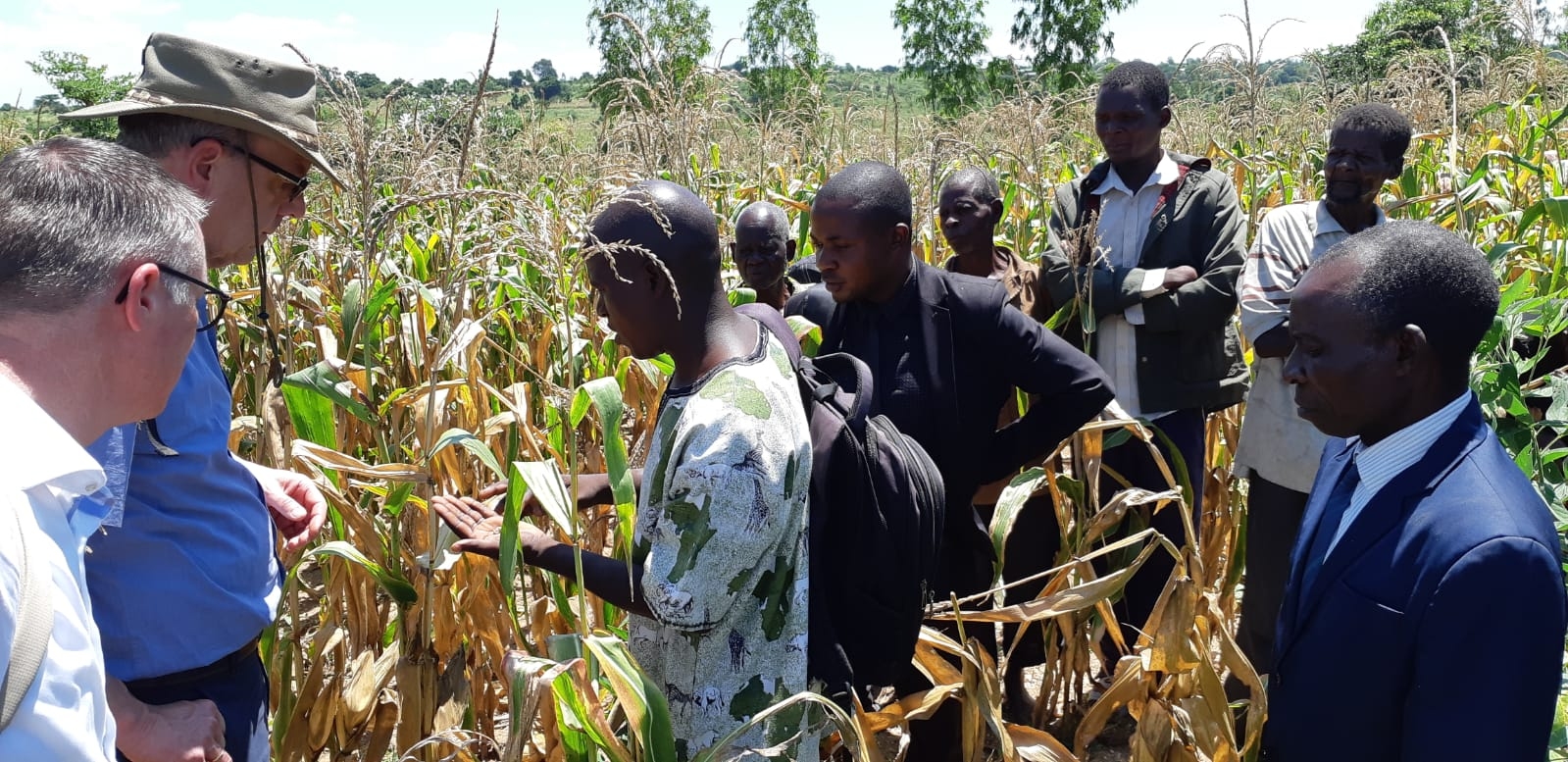 Woensdag 27 maart 2019: Vandaag vertrokken we nog vroeger dan gisteren, namelijk om 6.40 uur vanwege een lange tocht naar het noorden. Deze dag mocht ik de landcruiser besturen. Dat is best wennen, want in Malawi rijden ze links. Om 10.30 uur werden we met gezang van de vrouwen ontvangen in Ntaja. Na een warm welkom hebben we Psalm 23 gelezen en daar wat over gezegd. Vervolgens zijn we naar de akkers gelopen om de mais te bekijken. Dit project wordt begeleid door Art of Charity en door de GDC bekostigd. Op het eerste veld stond de mais er goed bij. Op het tweede veld minder. Eigenlijk is de mais wat te laat geplant. Ook heeft men last van wormen in de mais. De mais op het derde veld stond er mooi bij.