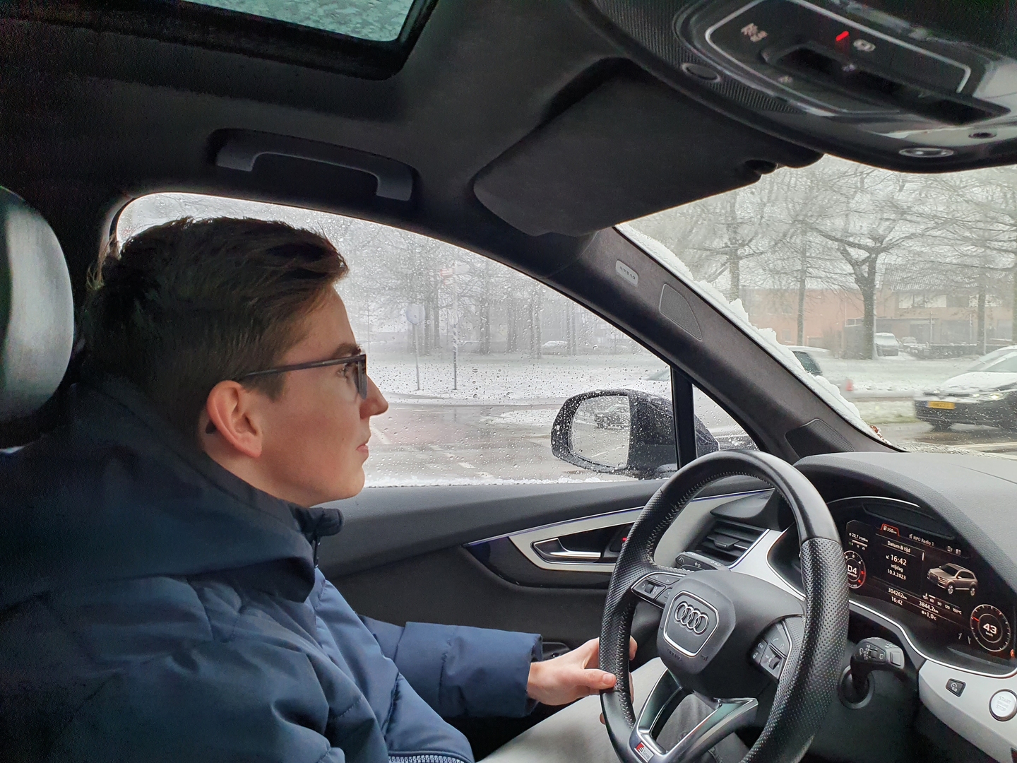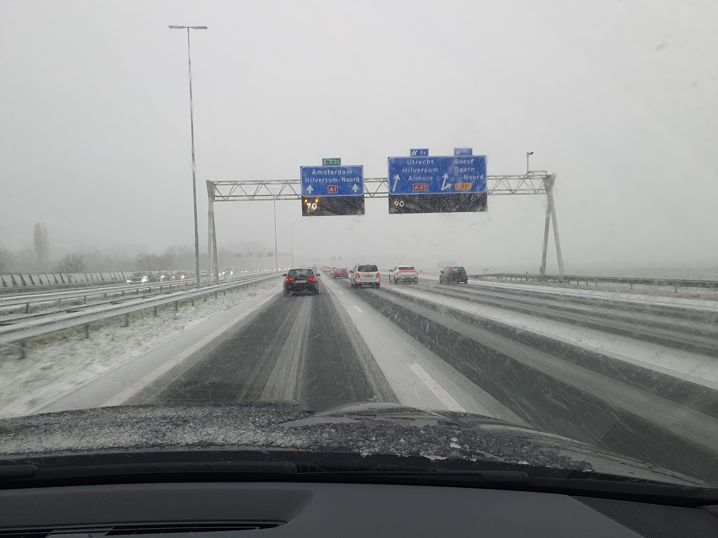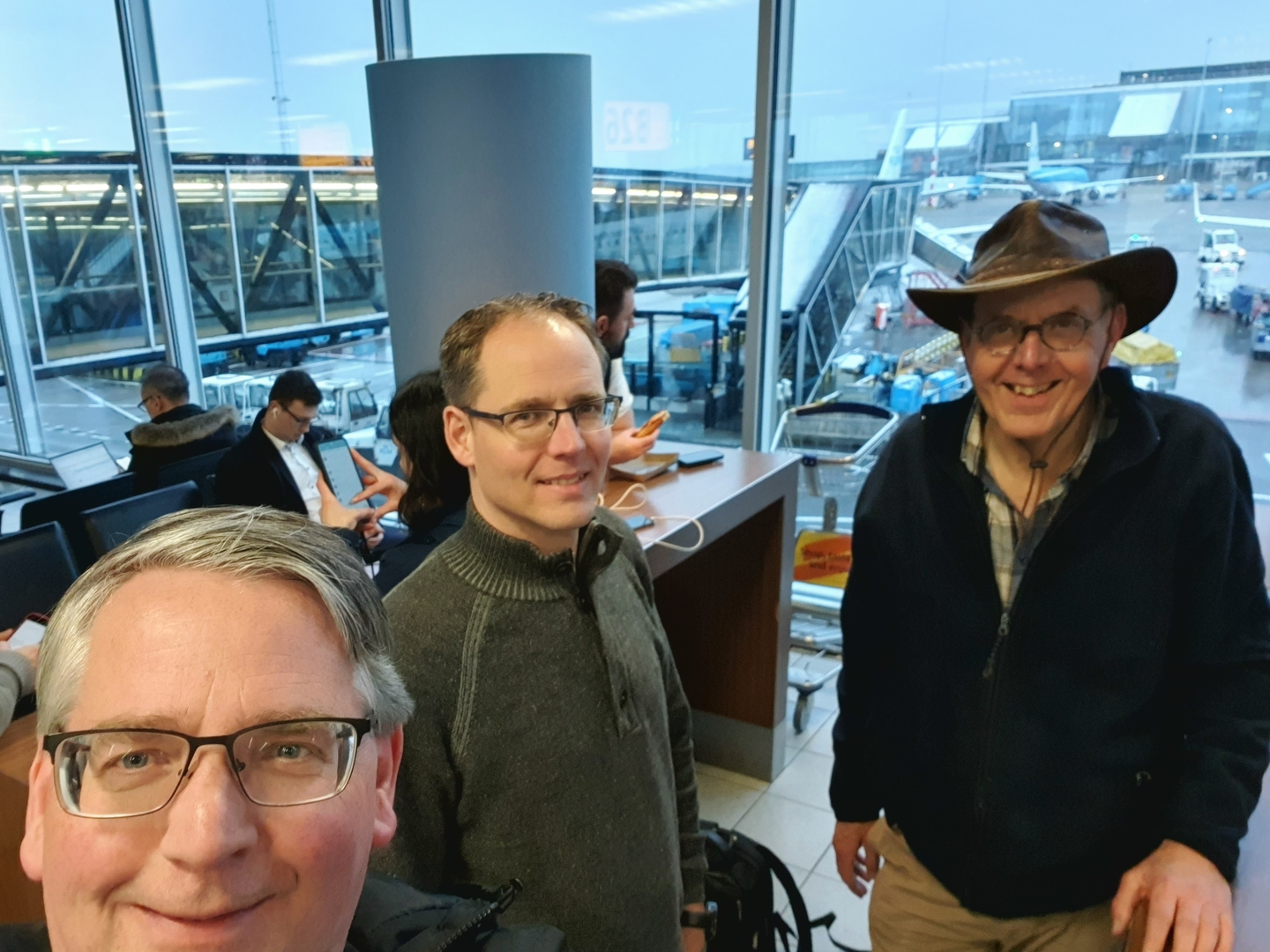 Toen ik onder de huwelijksdienst naar buiten keek, werd ik toch wel wat zenuwachtig. Het sneeuwde en dat zou de rit naar Schiphol zeker gaan vertragen. Direct na de huwelijksdienst ben ik om even over half 5 bij zoon Stephan ingestapt die mijn met snelle en ook kundige wijze over de witte wegen met de Audi Q7 veilig om 17.45 uur afleverde voor Vertrekhal 1 van Schiphol. Nog bedankt, Stephan!